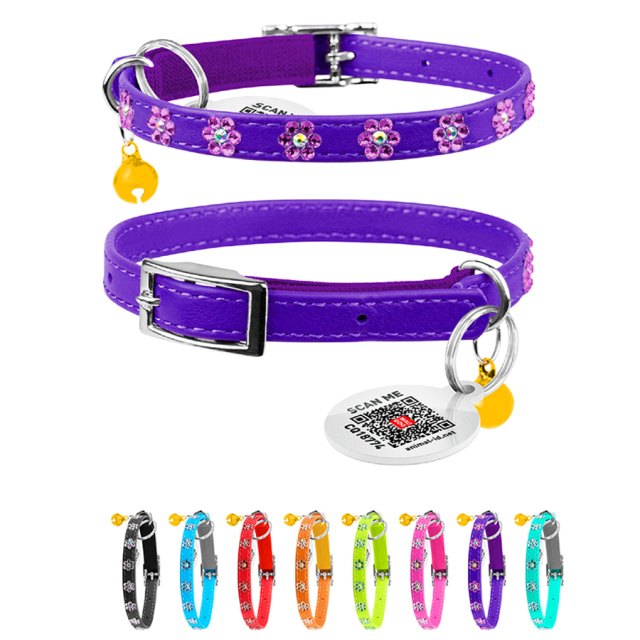 Нашийник WAUCAT Glamour з резинкою, клейовими стразами «Квітка» для котів (ширина 9мм, довжина 22-30см) фіолетовий