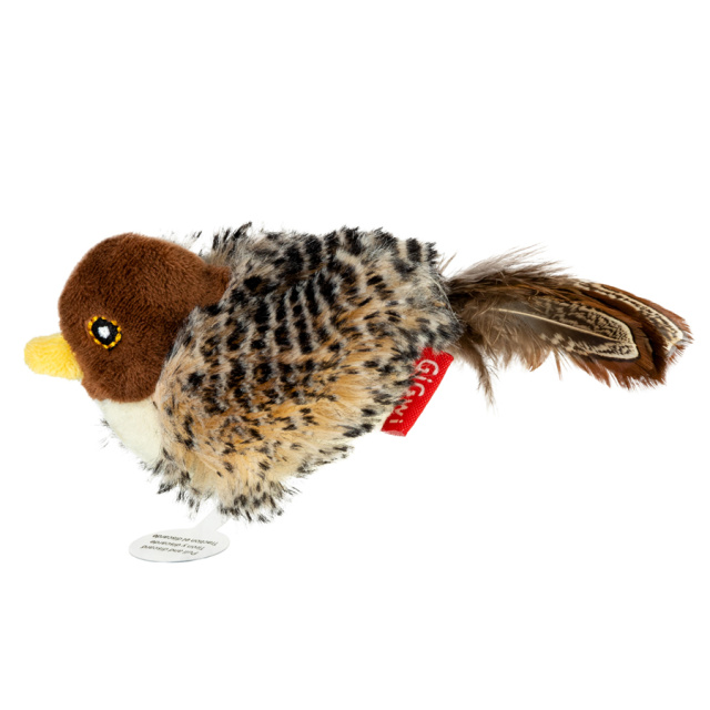 Інтерактивна іграшка для кішки із вбудованим звуковим чіпом. При торканні іграшки лапками кішки, вбудований звуковий чіп видає реалістичні звуки птиці. Перед грою треба висмикнути пластиковий запобіжник.